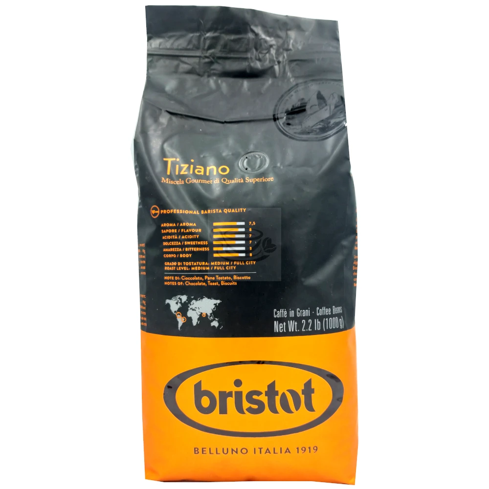 Bristot Tiziano qualita superiore is a blend of the best quality arabica and robusta coffee beans. The beans come from Central and South America, India & Africa.
